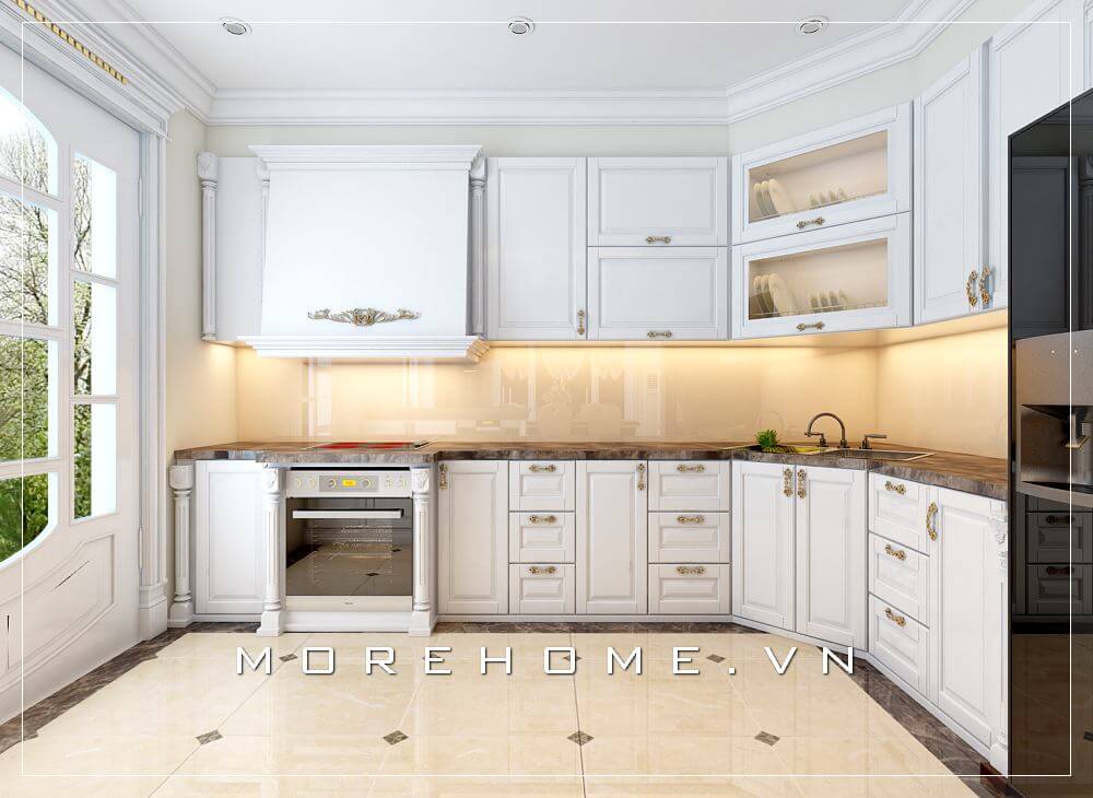 Mẫu tủ bếp gỗ đẹp tân cổ điển màu trắng cao cấp, tiện nghi cho phòng bếp